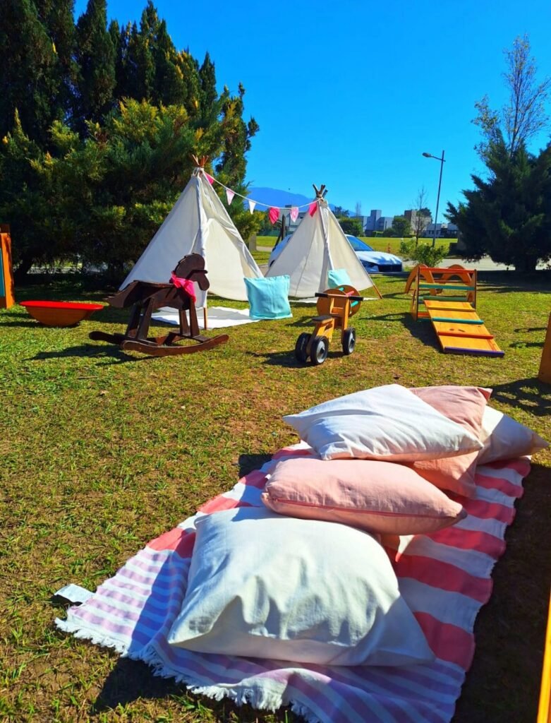 Ideal para que los chicos y no tan chicos, 5 años en adelante, tengan un lugar especial. Un mini tablon, con mantas y almohadones, Carpita Tipi, jenga, Ta Te Ti y aros ula ula.