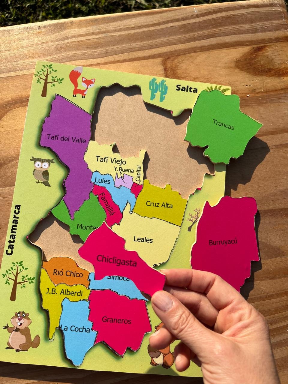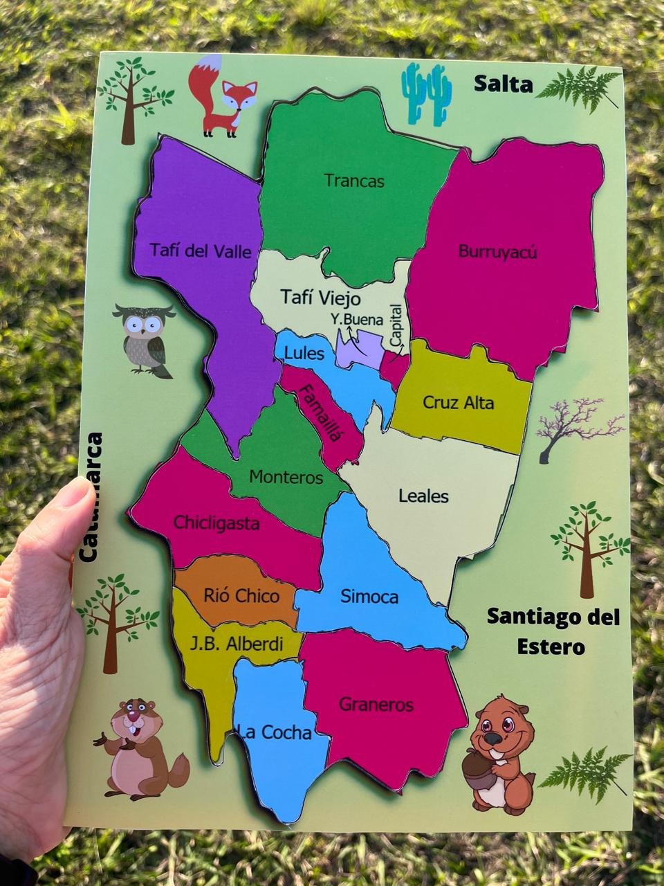 De MDF , laminado, aprendemos los departamentos de la Provincia de Tucumán, cada pieza de un color diferente e indica un departamento, siempre es mas fácil aprender jugando